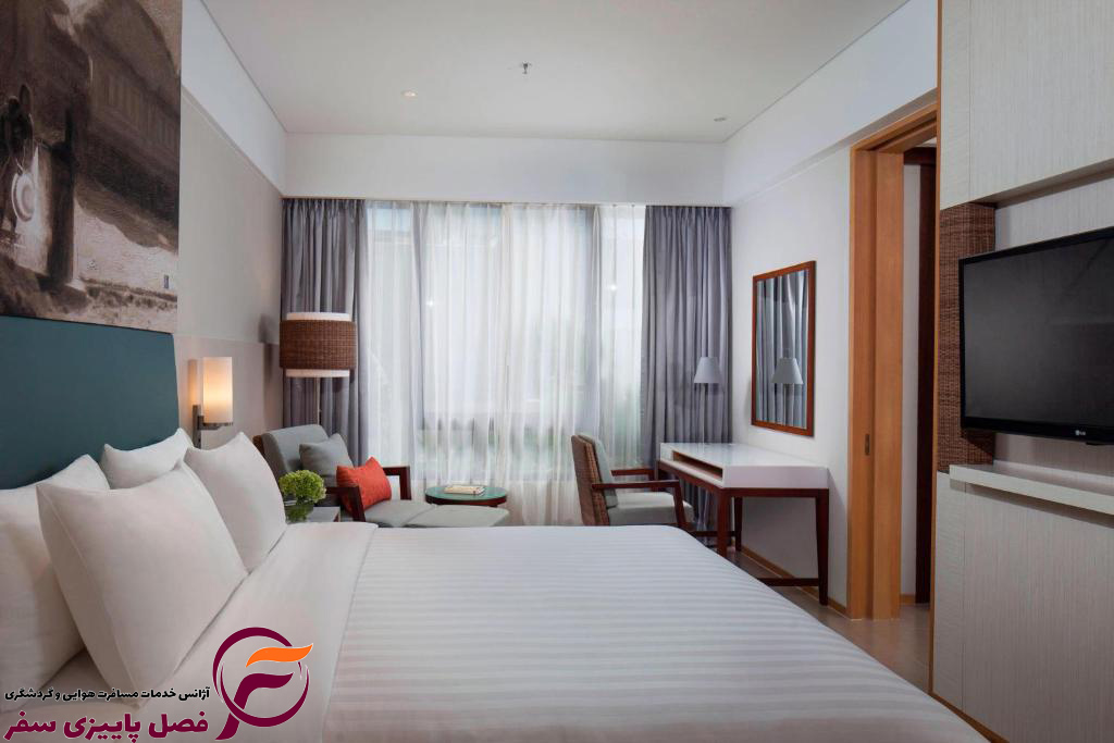 Courtyard by Marriott Bali Seminyak یک استراحتگاه مجلل در فاصله 5 دقیقه پیاده روی از ساحل Seminyak ارائه می دهد. این هتل دارای استخر روباز، مرکز تناسب اندام و اسپا است و سرویس رفت و برگشت رایگان به ساحل سمینیاک را ارائه می دهد. یک رستوران در محل موجود است، در حالی که WiFi به صورت رایگان در همه مناطق در دسترس است. اتاقهای مجهز به تهویه مطبوع که دارای فضای داخلی مدرن هستند، دارای تلویزیون کابلی صفحه تخت، پایه آیپاد و گاوصندوق است. میهمانان می توانند در تراس یا بالکن خصوصی استراحت کنند و از چشم انداز فضای سبز لذت ببرند. مینی بار و کتری برقی نیز از جمله امکانات رفاهی اتاق هستند. Courtyard by Marriott Bali Seminyak 15 دقیقه با ماشین تا میدان Seminyak و خیابان Oberoi فاصله دارد، در حالی که فرودگاه بین المللی Ngurah Rai 30 دقیقه با ماشین فاصله دارد. این هتل با پذیرش 24 ساعته، امکانات نگهداری چمدان و امکانات جلسه/ضیافت در محل دارد. کارکنان می توانند ترانسفر فرودگاهی، اجاره خودرو و خدمات نگهداری از کودکان را با هزینه اضافی ترتیب دهند. خدمات خشکشویی نیز ارائه می شود. رستوران Seminyak Kitchen و بار استخر انواع غذاهای بین المللی را سرو می کنند. غذاها را نیز میتوانید در خلوت اتاقهای مهمان میل کنید. زوج ها به طور خاص این مکان را دوست دارند - آنها به آن برای یک سفر دو نفره امتیاز 9.3 دادند.